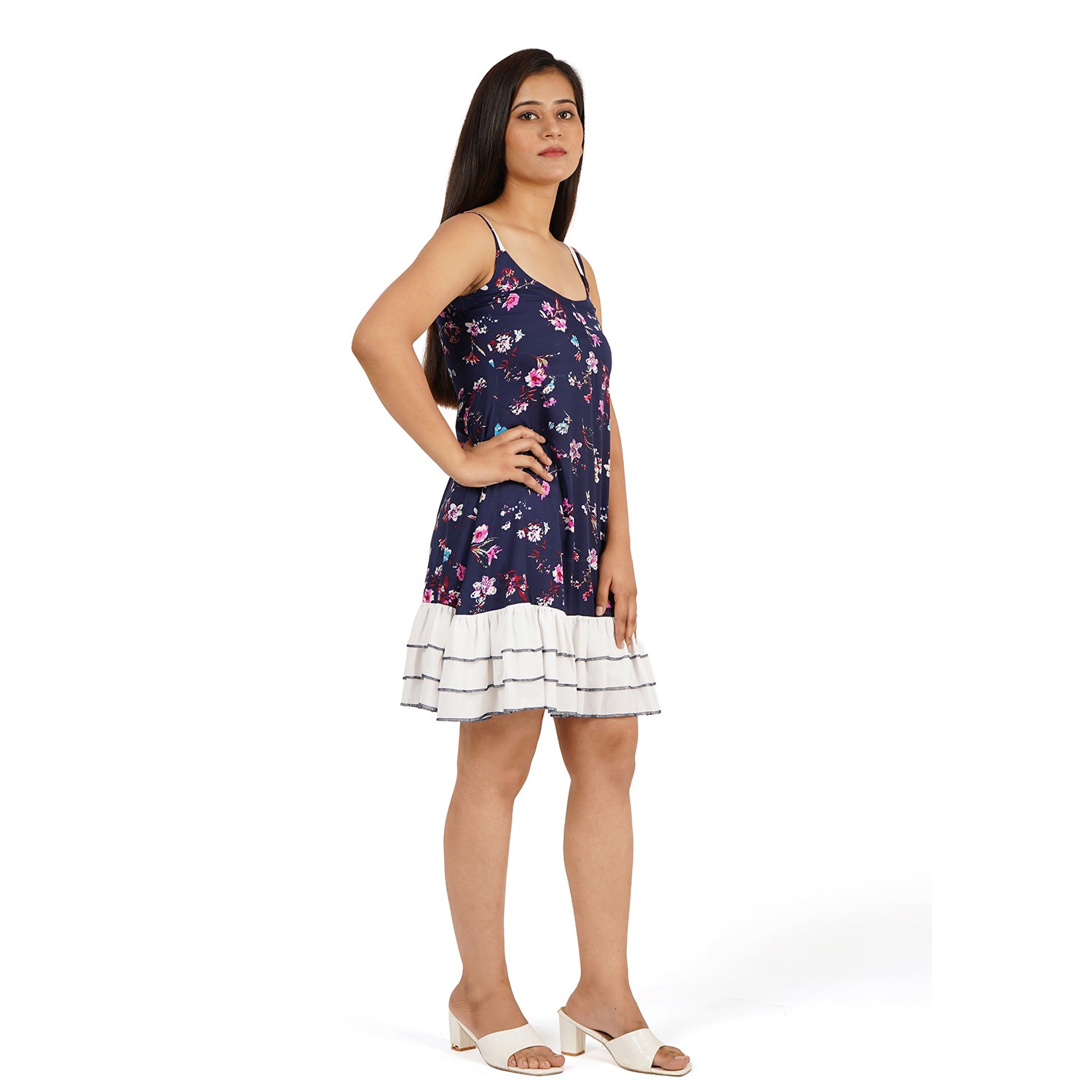 Color: Navy Blue with Multicolor Floral Print and White Layer Hem