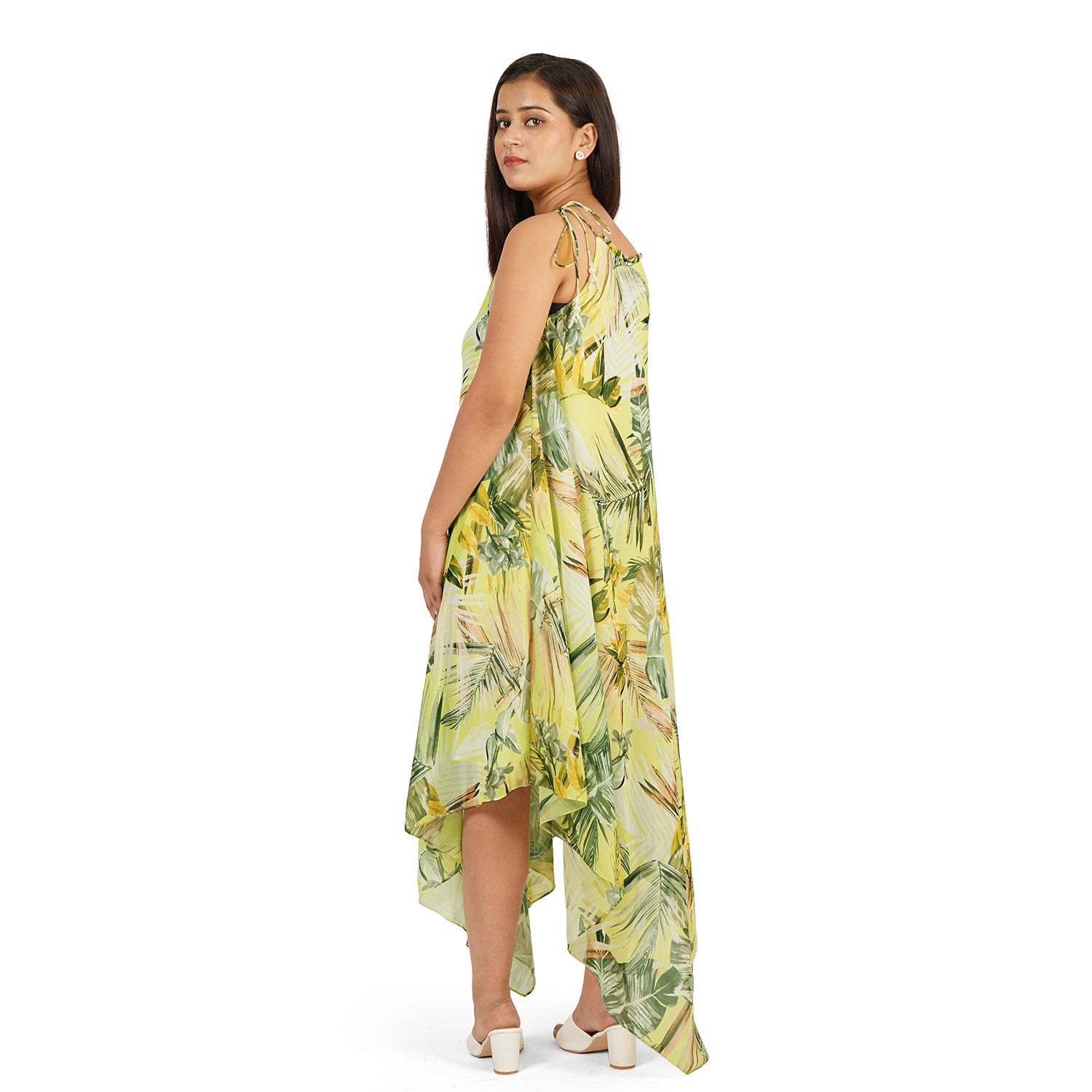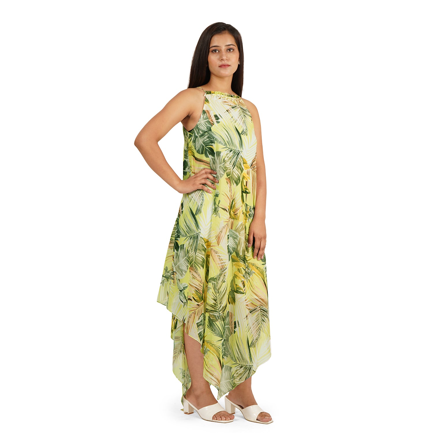 Trendy green leaves digital printed western dress with sleeveless style, crafted in lightweight georgette. Perfect for beach outings, brunch and parties.