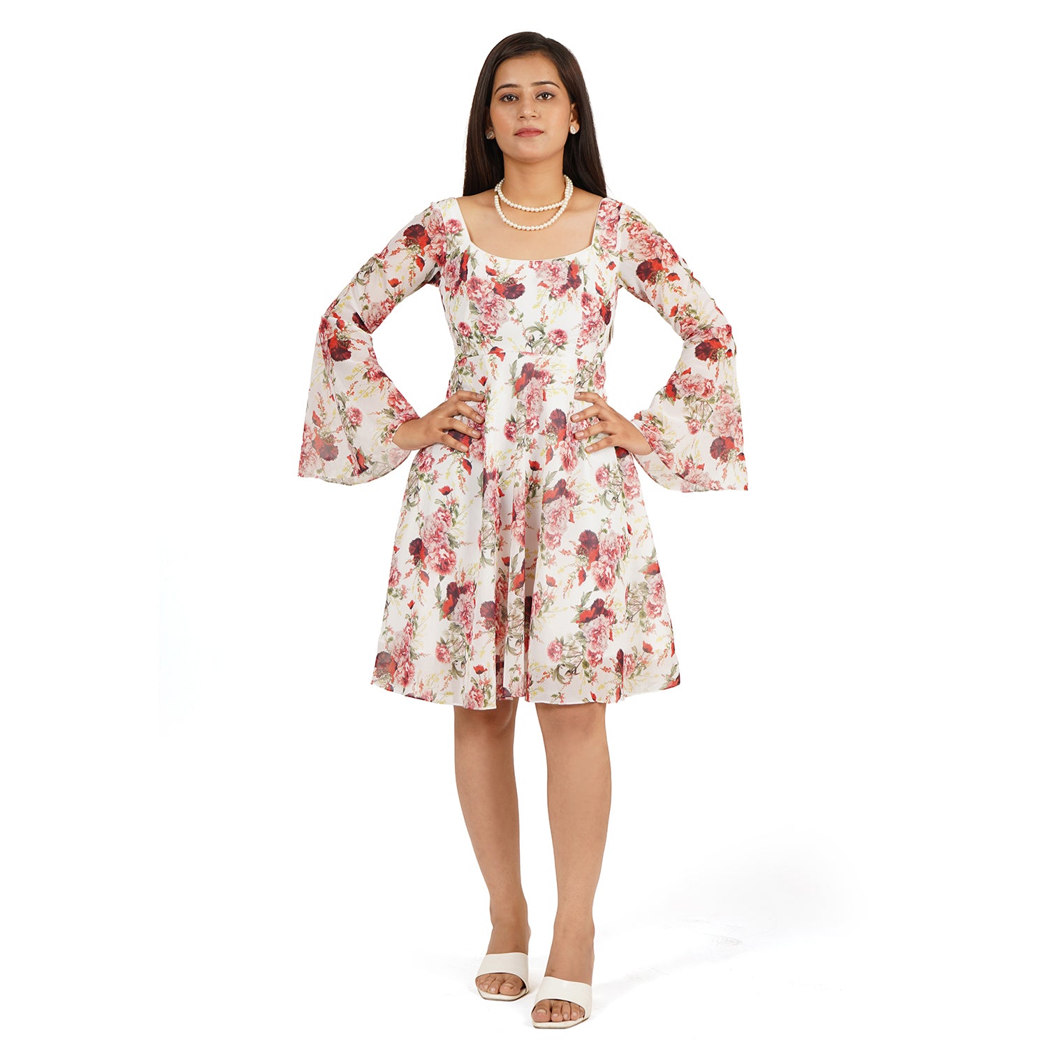 Stylish red rose floral digital printed fit & flare dress with bell sleeves, crafted in premium crepe. Perfect for parties, events and outings.