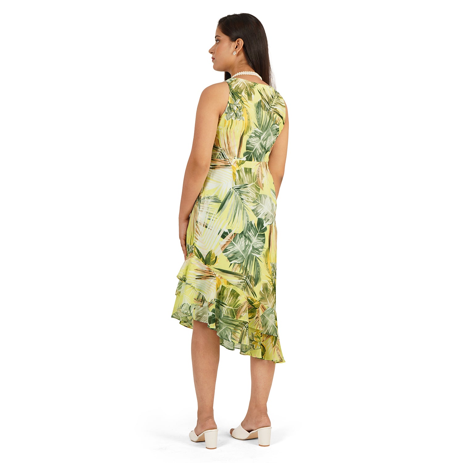 Trendy green leaves digital printed western dress with stylish ruffle hem and sleeveless design in soft georgette. Perfect for parties and summer outings.