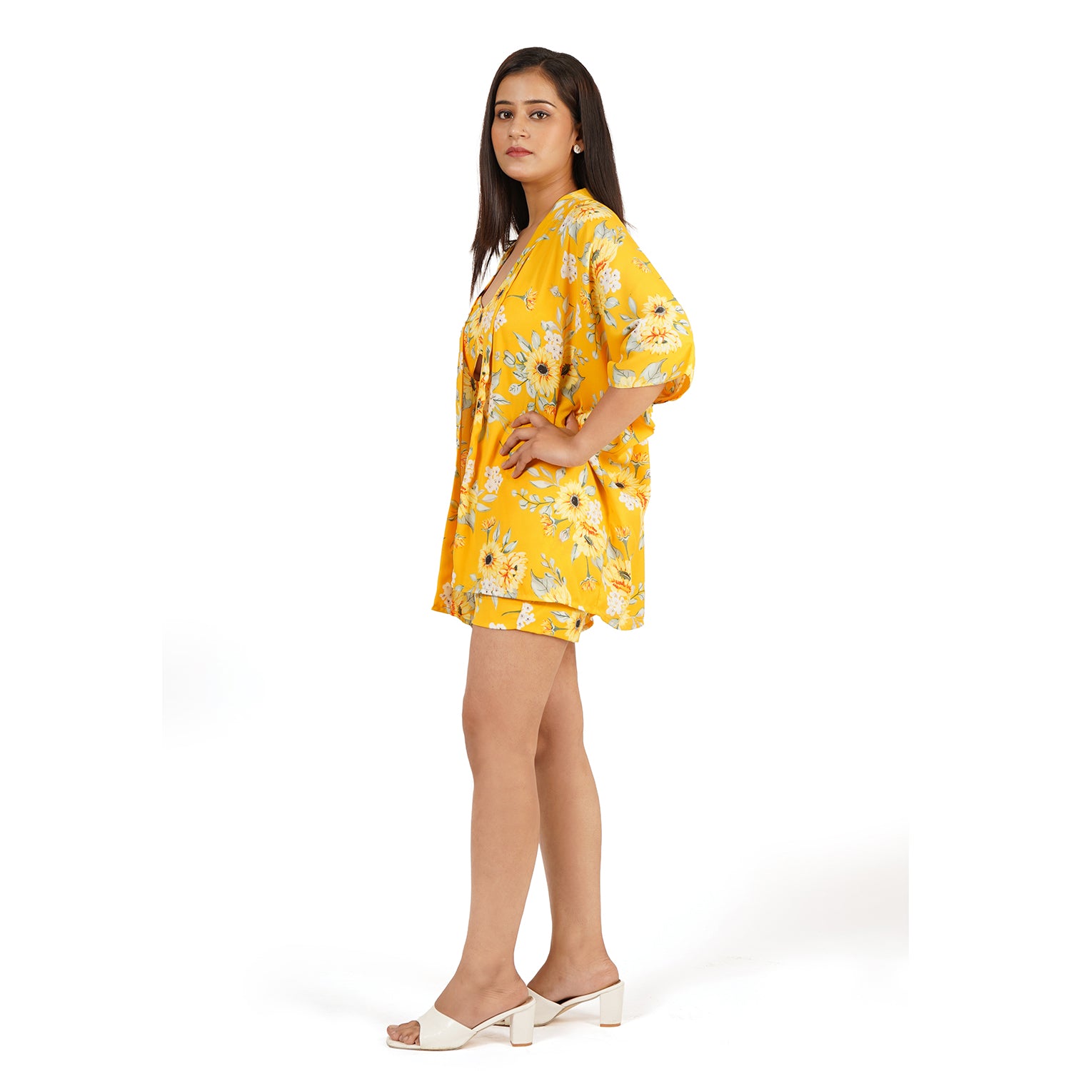 Yellow Floral Printed Shorts Bustier Kaftan Jacket Set – Summer Cool Fabric