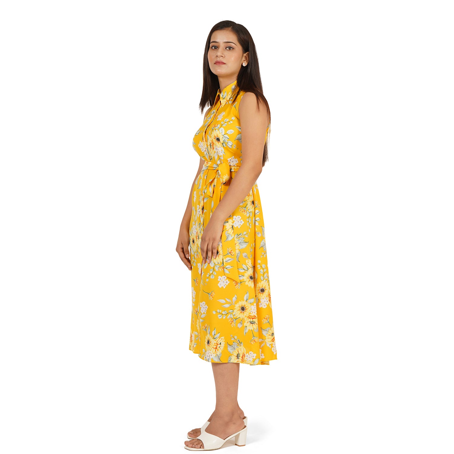 Brighten up your wardrobe with this yellow floral sleeveless midi dress featuring a chic shirt collar and waist tie-up. Made with summer cool fabric for all-day comfort.